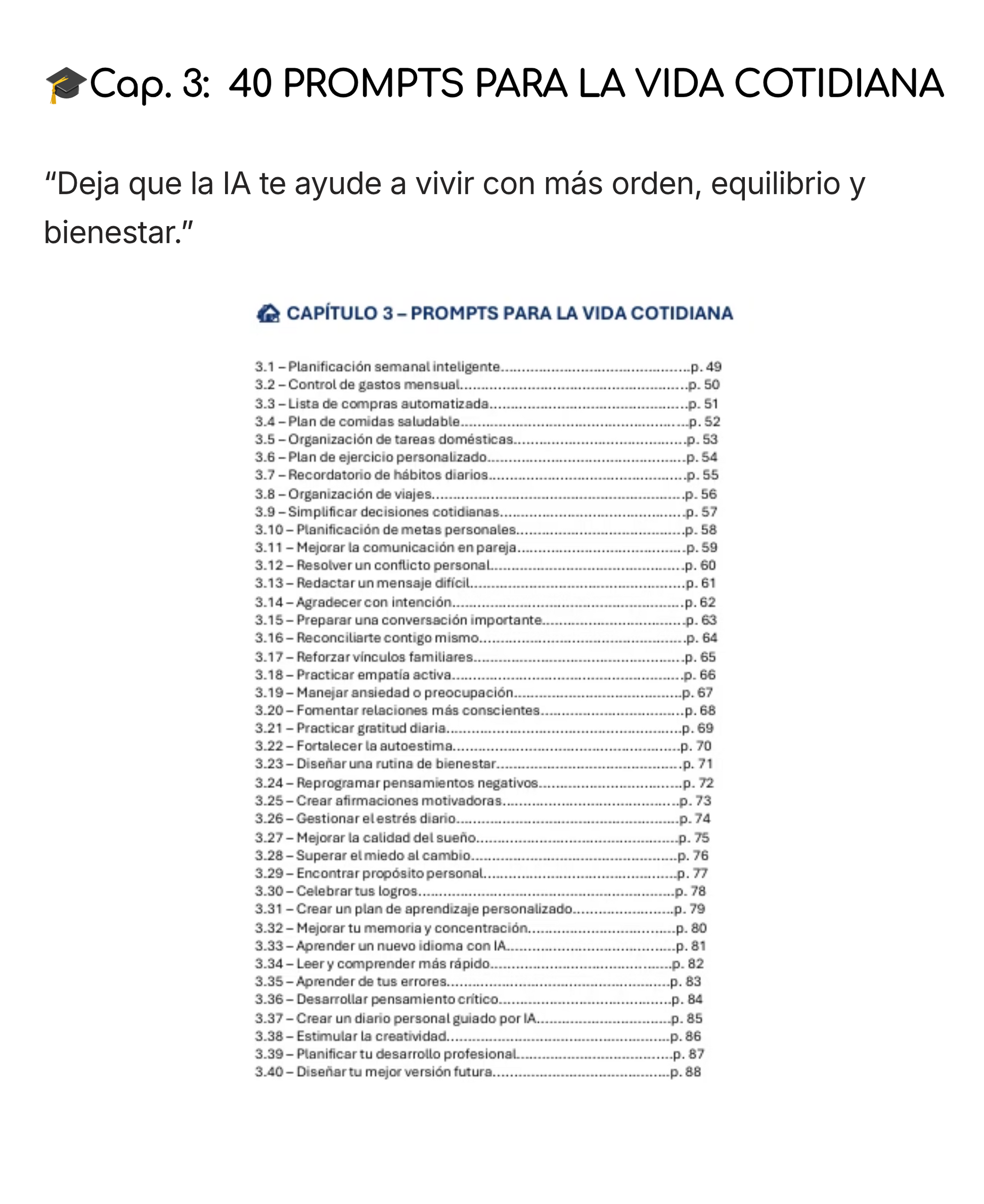Productividad, redacción, análisis, aprendizaje, creatividad y negocio. Los prompts están organizados por capítulos prácticos.