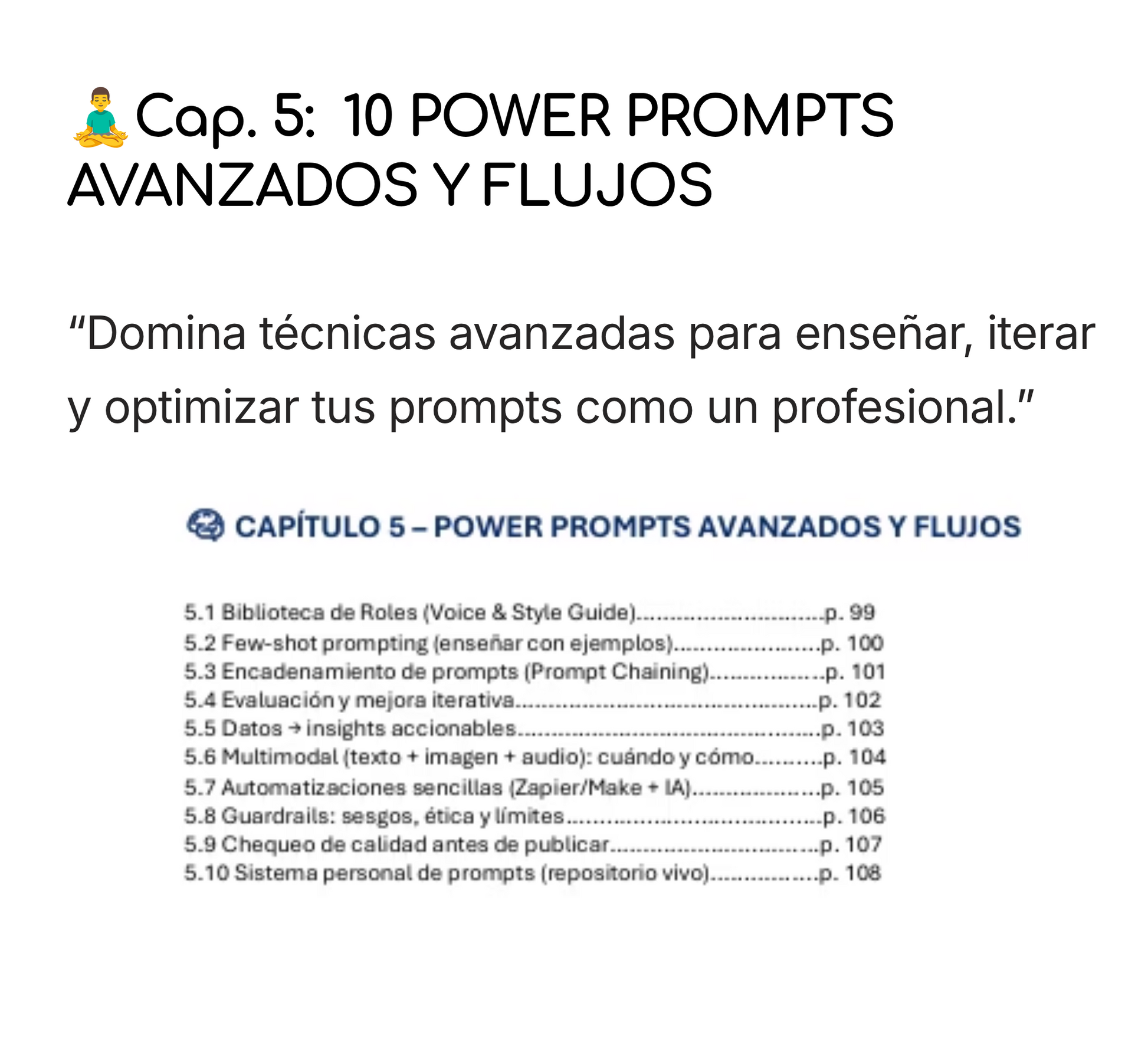 - 6 capítulos prácticos: productividad, redacción, análisis, aprendizaje, creatividad y negocio.